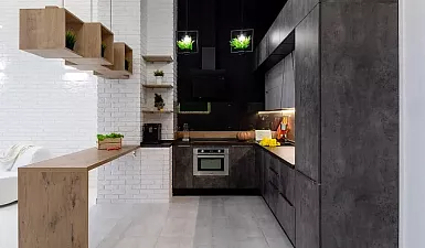 • Расширенные возможности в выборе актуального дизайна при стилизации кухонных интерьеров позволяют использовать экоплиты для оформления фасадов не только уголков и модулей, но и эффектных гарнитуров.