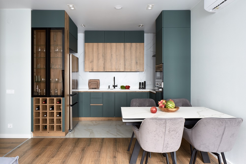 Многие современные проекты включают пеналы или колонны — это высокие шкафы, которые доходят почти до потолка. Их преимущество в том, что они позволяют разместить сразу несколько функциональных зон: встроенную технику, полки для хранения продуктов, выдвижные системы.