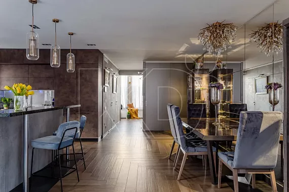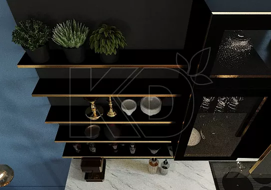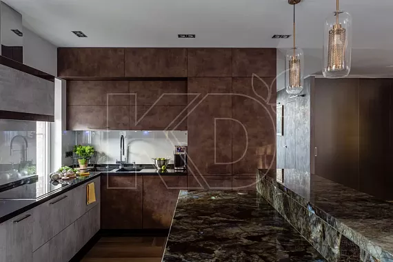 Освежить бежевую мебель поможет черный потолок на кухне. Остальные поверхности могут быть оформлены по-разному. Главное – задействовать светлые оттенки, чтобы уравновесить такое контрастное решение. Стены могут быть бетонными или кирпичными.