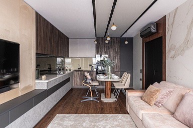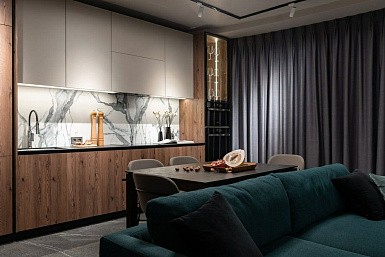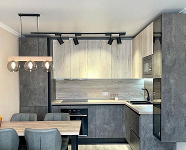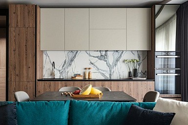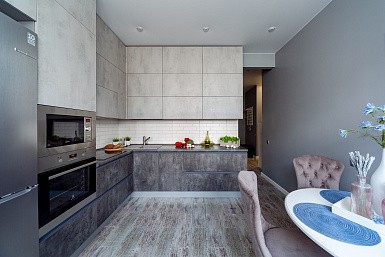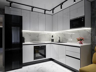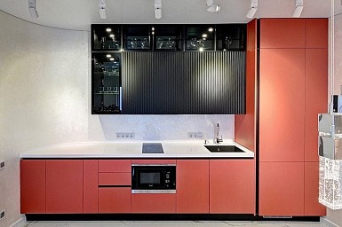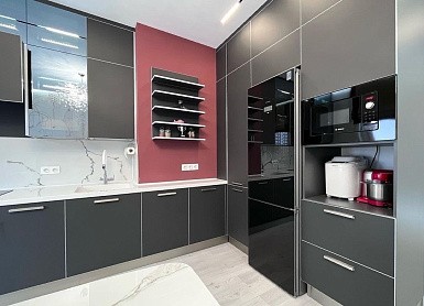 В небольших комнатах с цветовой палитрой особо не разгуляешься. Как правило, для таких пространств выбирают бежевые, белые и другие светлые оттенки. Но это не значит, что кухня должна быть унылой и монотонной. На помощь придет умеренное применение модных расцветок – черного, антрацитового и темно-серого. Использовать эти цвета можно для отделки цоколей, фурнитуры, открытых навесных полок.