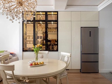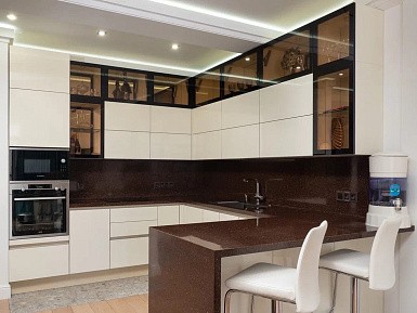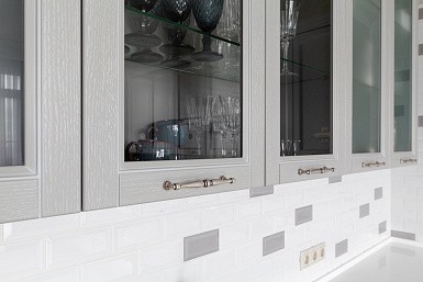 Фасады с матовыми или прозрачными стеклами смотрятся интересно и дорого. Необязательно использовать их в большом количестве. Для бюджетного решения достаточно двух-трех остекленных дверец, зато пространство будет выглядеть гораздо наряднее.