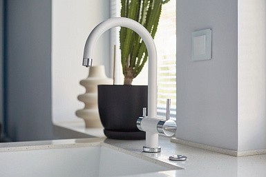 Светлые однотонные фасады можно удачно комбинировать с более темными элементами – цоколями, корпусом и столешницей. И не забывайте про оформление фартука. Необязательно делать его под цвет гарнитуру. Гораздо интереснее, если он будет контрастным или многоцветным.