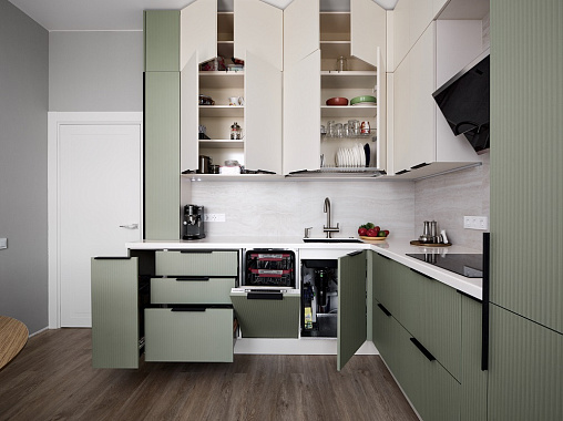Индивидуальный заказ позволяет создать проект, идеально вписывающийся в любое пространство — от малогабаритной кухни в хрущёвке до просторного помещения в доме. При стандартных решениях всегда есть компромиссы: ниши, углы, выступы. При индивидуальных размерах дизайнер учитывает каждую деталь, чтобы использовать площадь рационально.