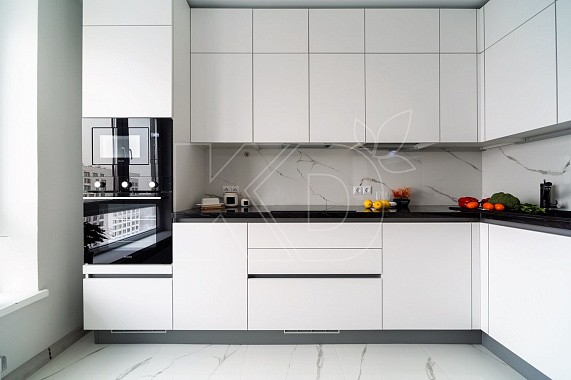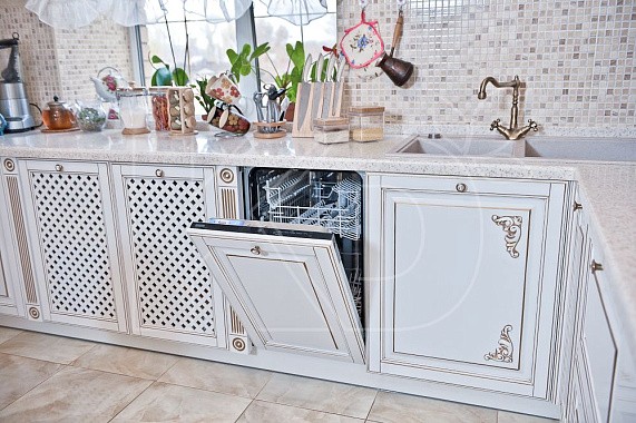 Второй вариант позволяет скрыть всю бытовую технику за фасадами. В этом случае мебель изготавливают с учетом размеров микроволновки, холодильника, посудомойки.