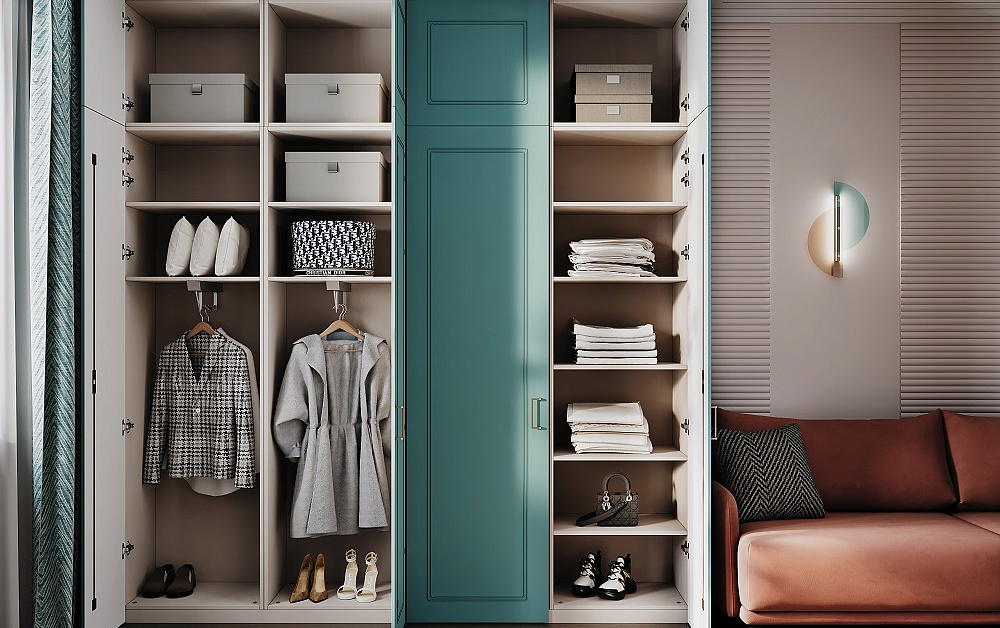 Эрика — шкаф с разумным подходом к организации хранения. Благодаря дополнительной антресоли, используется всё вертикальное пространство до потолка. Он вмещает: сезонную одежду, обувь и сумки, коробки с аксессуарами и любые другие вещи, которые важны, но не требуют частого доступа.