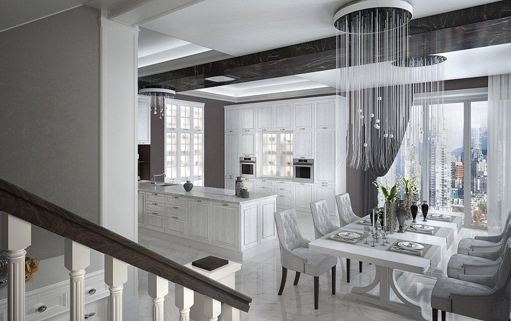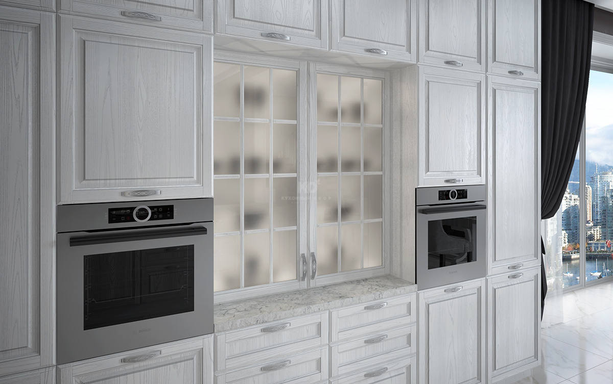 Фасады «Виконта» изготовляются из массива натурального дуба. Они бесподобно смотрятся в лёгком, словно предрассветная дымка, белом цвете с серебристой патиной. Фасады украшает красивая классическая филёнка и элегантные посеребрённые ручки с тонким кружевом. Чистоте и лёгкости линий вторят и матированные витражи высоких, интегрированных прямо в стены буфетов. Присмотритесь внимательно к получившемуся образу. Это просто отличная кухня? Нет, это нечто намного большее!