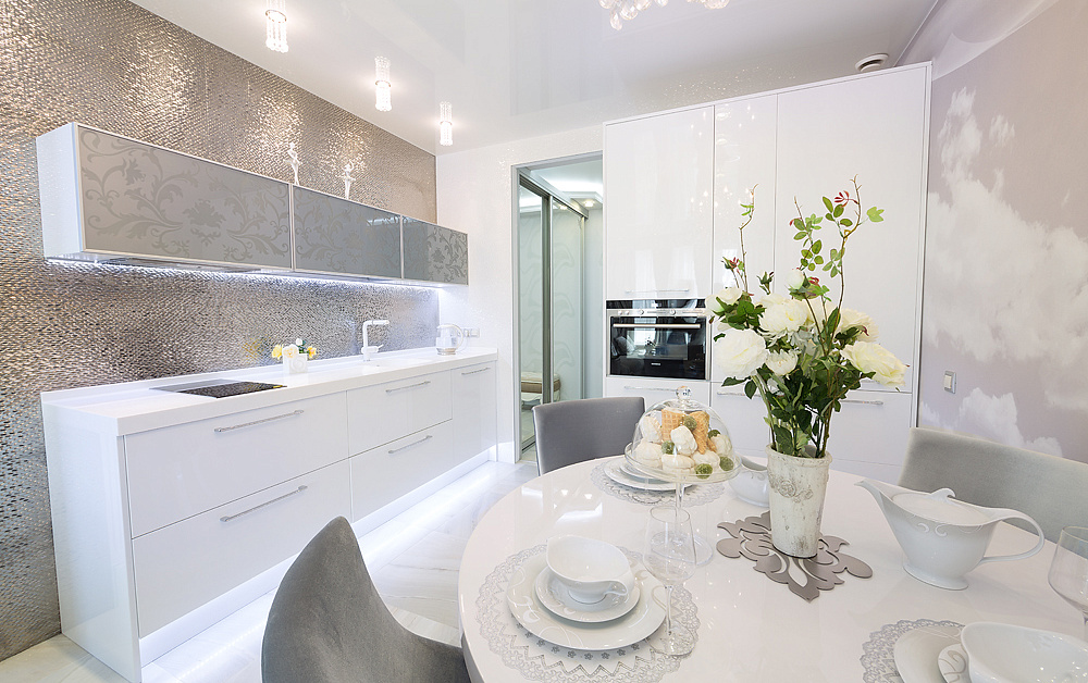 Хозяева квартиры сделали выбор в пользу элегантной, изысканной и современной модели «Фаворит» в белом варианте исполнения. Интересно, что именно цвет является основным выразительным элементом декора данного интерьера. Безусловный авторитет белого не случаен: дочь хозяйки квартиры не представляет своей жизни без танца, а как известно, король танца — балет, ассоциирующийся с белоснежными пачками, пуантами... Фреска на стене изображением дочери Инны Григорьевны подчеркивает атмосферу, наполненную любовью к хореографии. Изящная и утонченная модель с тонкими современными чертами вдохновлена классическими образами для жизни в современном мире. Гарнитур укомплектован совершенными системами открывания, выдвижения и хранения, все ящики оснащены доводчиками. Все элементы кухни максимально функциональны. Фасады гарнитура глухие, гладкие, без фрезеровок. Тем не менее, о торжестве высокого стиля напоминают ручки, инкрустированные стразами Swarovski. Еще один шикарный акцент — панно из золотой плитки над рабочей зоной с белоснежной столешницей. Подсветка цоколя рабочей зоны эффектно подчеркивает чистоту цвета и фактуры.