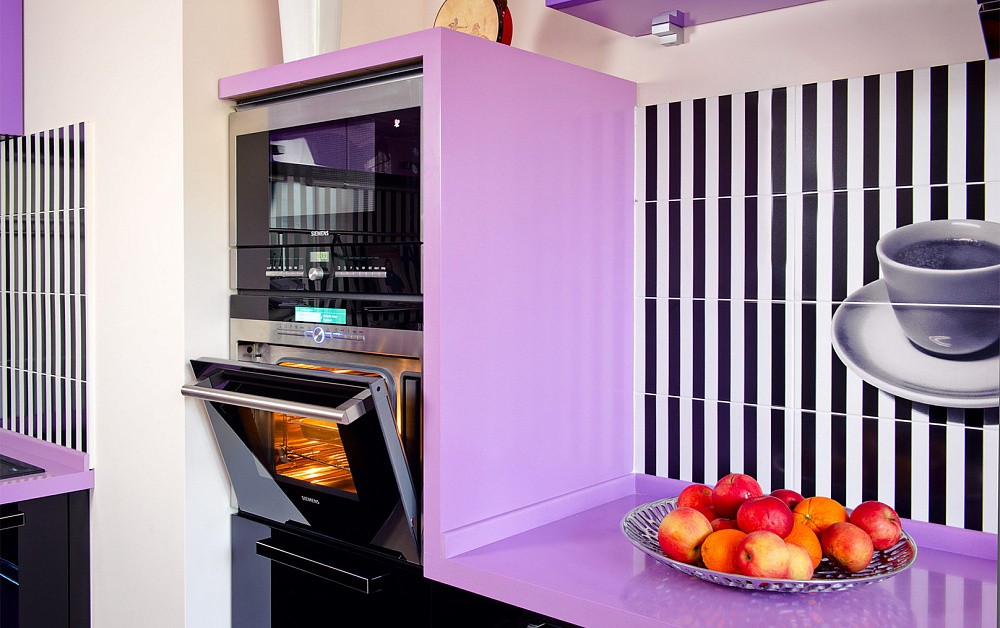 Яркий фиолетовый цвет отлично подчеркнут стильным чёрным, а лиловое полотно столешницы -своеобразный цветовой акцент, являющийся символической границей. Богатый функционал гарнитура спрятан за лаконичными фасадами с длинными ручками. В центре всей композиции - барная стойка с чёрными стульями.