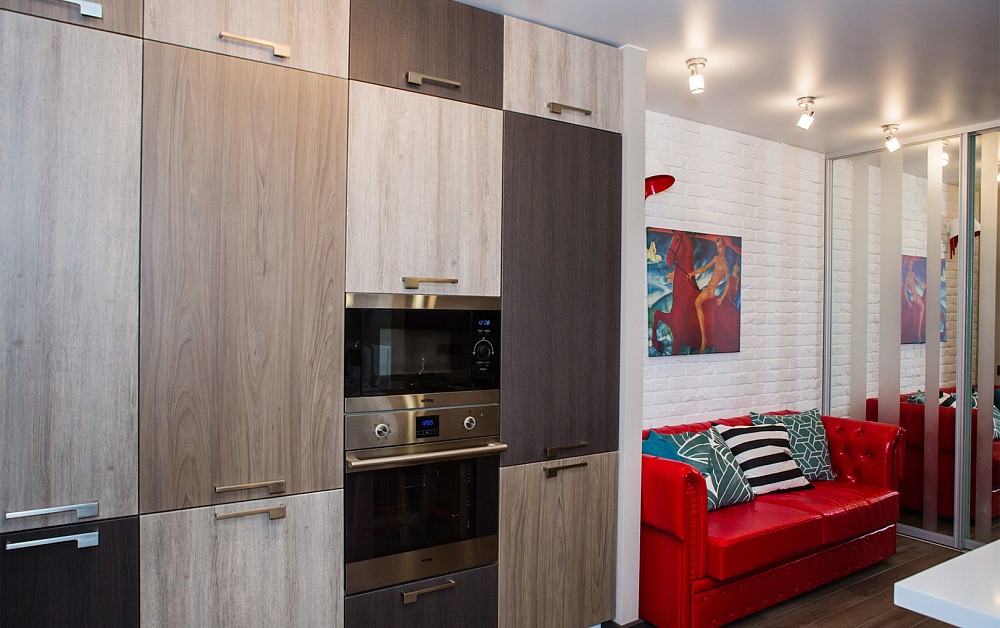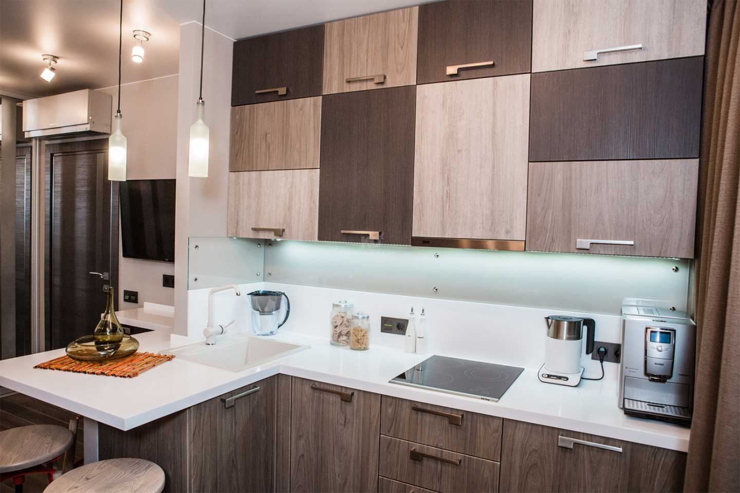 Перед дизайнером проекта - Марией Поповой стояла задача создать современный, компактный и стильный интерьер, воплотить стремление хозяина квартиры к минимализму. В конечном итоге выбор пал на гарнитур «Эмма» из немецкой коллекции «Kuchen-hof». Модульная система кухни очень разнообразна, как и фактура фасадов, которые выполнены из MDF, покрытых экомембраной с эффектом обработанного дерева.  В дизайне кухни использована актуальная мировая тенденция - сочетание разноуровневых модулей, рисунков и цветов фактур. На такую кухню одинаково приятно смотреть и прикасаться к ней- ощущение натуральной древесины присутствует в полном объеме. Интересна комплектация модулей, расположенных вдоль двух параллельных стен. За счет того, что бытовая техника спрятана за глухими фасадами отдельно стоящих модулей, интерьер обретает черты кухни-студии, что тоже является актуальным и модным направлением в дизайне. Несмотря на лаконичность и компактность, кухня «Эмма» выглядит очень эффектно. Она оснащена самыми современными системами выдвижения и хранения. Прямые линии глухих фасадов, объемные вместительные ящики, сдержанная красота и максимальная эргономичность - "Эмма" знает, что нужно жителю мегаполиса!