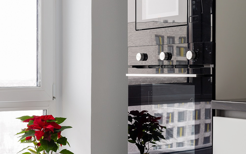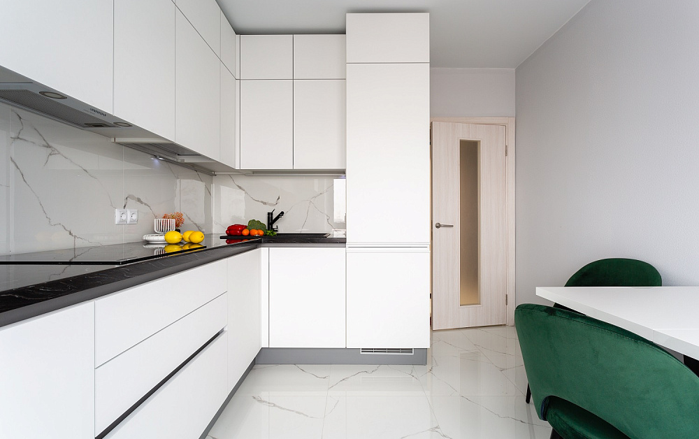 Стиль – первое слово, которое приходит на ум при взгляде на эту «Ханну». Она выполнена «под потолок» и использует модные цветофактурные контрасты. Белые фасады из МДФ с «бархатистым» покрытием «Extra Touch Matt» здесь прекрасно сочетаются с тёмной встроенной техникой, столешницей и системой открывания «Space Line». Система «Space Line» (SL) – то, что нужно для современного, лаконичного гарнитура. Она не только позволяет обойтись без видимых ручек, но и добавляет «Ханне» «скульптурной» выразительности. Так, эффект «приподнятой» столешницы здесь достигнут именно благодаря использованию «Space Line».