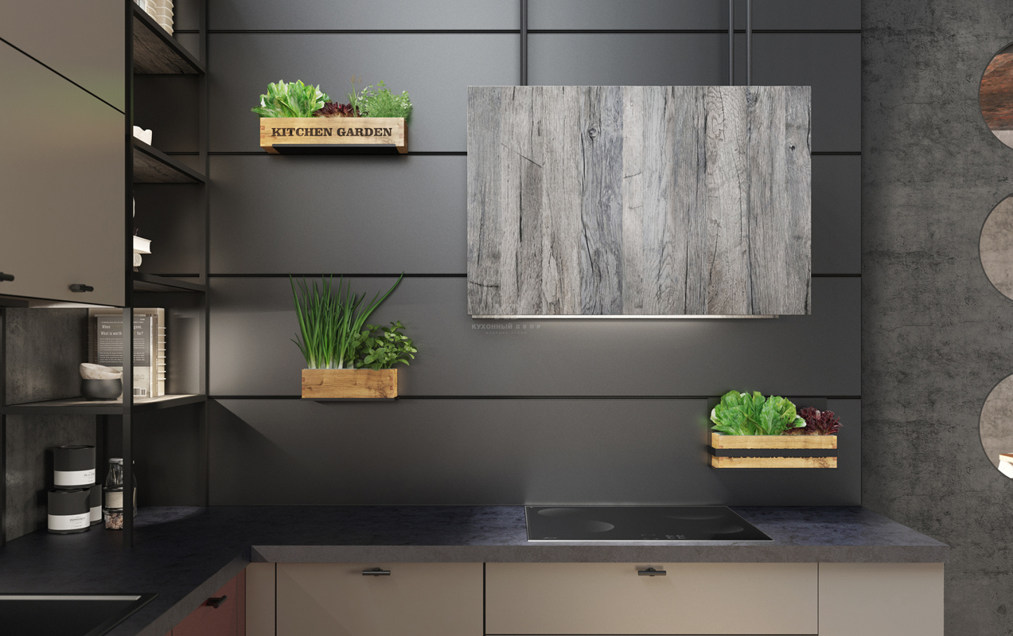 Кухня наполнена природными акцентами. Так, декоративный короб под вытяжку здесь имеет фактуру натурального дерева, равно как и вместительная зона между мойкой и духовым шкафом. Дополнительный штрих – эко-декор на уникальной стеновой панели. Конструкция панели позволяет разместить элементы модной мини-рассады так, будто они парят в воздухе!