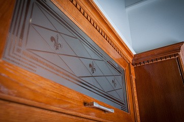 Пескоструйное нанесение узоров, вензелей, орнамента придаст гарнитуру особый шарм и сделает мебель подчеркнуто персонифицированной.Изысканные вензеля, цветочные орнаменты, замысловатые узоры, - изображение можно выбрать по каталогу, в котором представлено более 100 различных мотивов, подчеркнув с их помощью выбранный стиль и придав ему законченный вид.