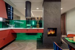 На комфорт и свободу здесь работает всё: цвета и фактуры фасадов, мелкие детали, техническое оснащение, грамотное зонирование и даже сама архитектура кухни! Так, полуостров с видом на гостиную выполнен в современном облегчённом варианте – здесь под столешницей установлены лишь компактные узкие ящики. Получается нечто среднее между столешницей и барной стойкой!