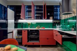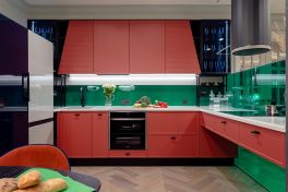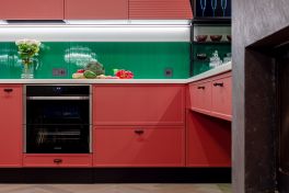 Нежный коралловый цвет очень идёт фасадам. Они, к слову, имеют разную фрезеровку – «рамочную» и «волнистую». Разнообразие форм не даёт глазу заскучать, поднимает настроение и пробуждает аппетит! А лаконичные вертикальные ручки и зоны с тонированным стеклом вносят едва уловимые нотки строгости. Эта «Джейн» беззаботна, но отнюдь не наивна! Интерьеры с ней в равной мере уютны и элегантны.